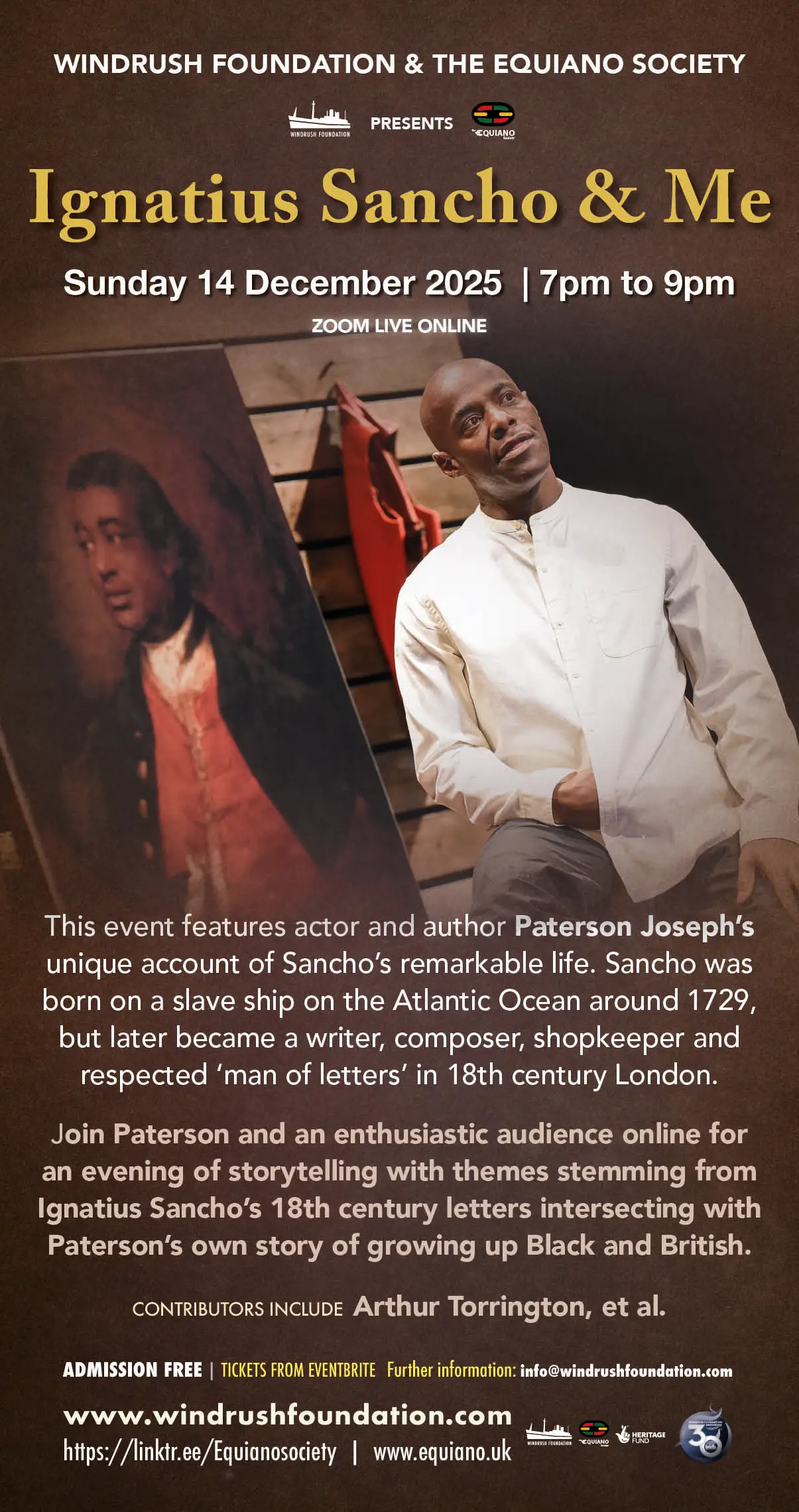 Join us online for Ignatius Sancho & Me, with author Paterson Joseph’s unique account of Sancho’s remarkable life brought to you by the WINDRUSH FOUNDATION & THE EQUIANO SOCIETY.